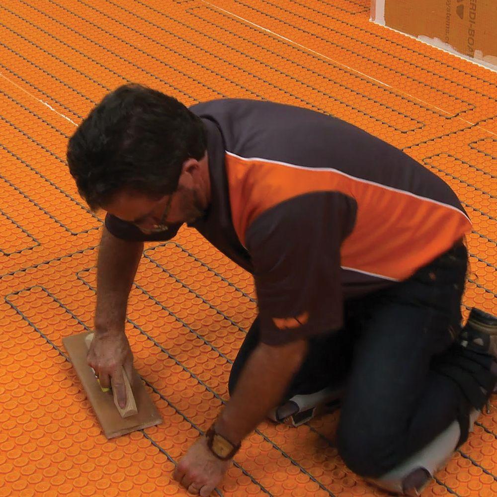 ThermoTile® is a modern “mat” system where the floor heat cable is factory spaced on a mesh for quick and easy rolling out and attaching to the subfloor. The mesh is easily cut with scissors for turning the mat to fit the floor. ThermoTile’s mesh also allows the thin-set mortar to penetrate the mesh and adhere the tile to the subfloor in 3 easy steps.2. Floor heat underlayment “pads” eliminate cement.